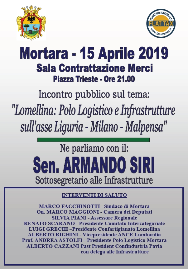 Di infrastrutture si parlerà anche in occasione dell’incontro “Lomellina: Polo Logistico e Infrastrutture sull’asse Liguria – Milano – Malpensa”. L’appuntamento è per lunedì 15 aprile dalle ore 21 in Sala Contrattazione Merci a Mortara con il sottosegretario alle Infrastrutture Armando Siri, Marco Facchinotti (sindaco di Mortara), Marco Maggioni (deputato), Silvia Piani (assessore regionale), Luigi Grechi (presidente di Confartigianato Imprese Lomellina), Renato Scarano (presidente Ascom Vigevano), Alberto Righini (vicepresidente Ance Lombardia e Alberto Cazzani (past president Confindustria Pavia con delega alle Infrastrutture).